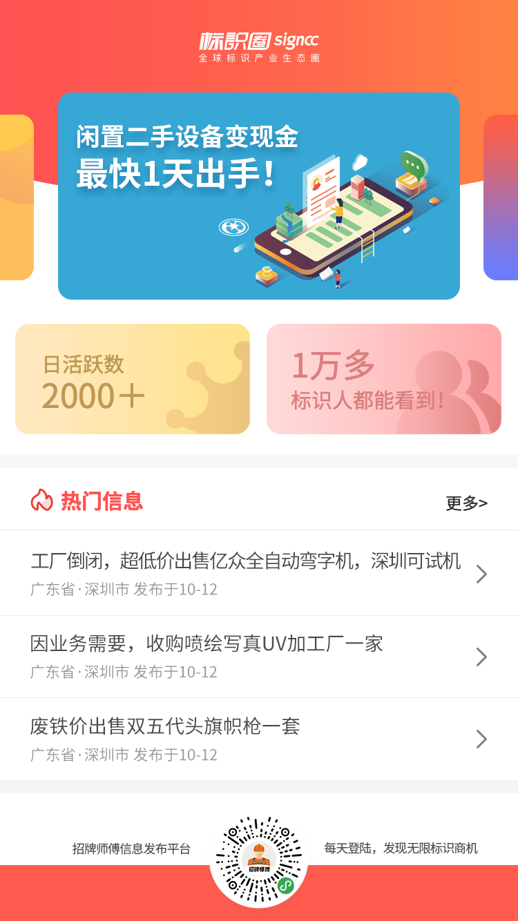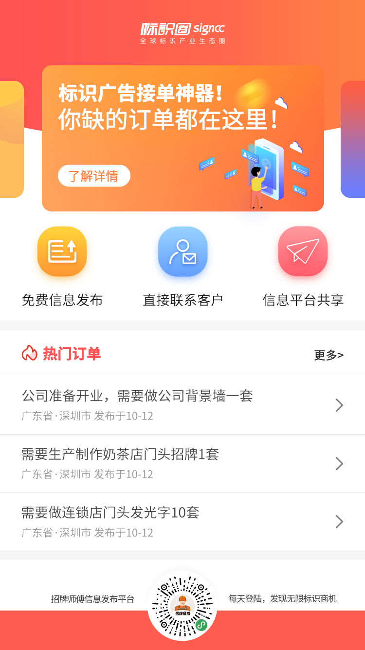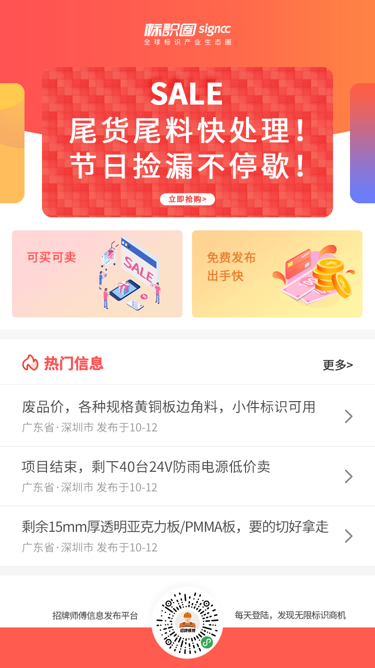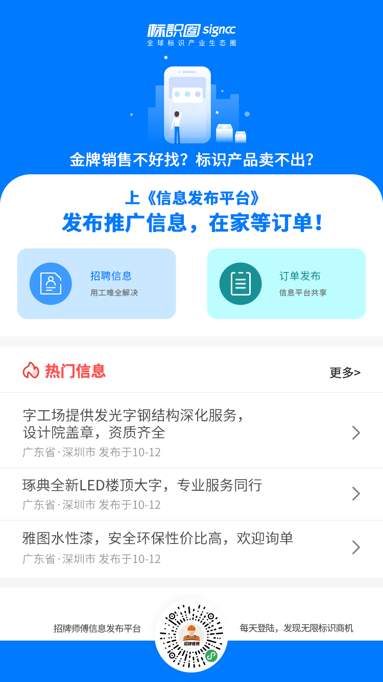 招牌师傅信息发布平台是深圳中标互联有限公司(标识圈)开发的标识广告行业信息共享服务,以标识圈旗下招牌师傅手机端小程序信息模块为载体,致力于打造标识行业最大流量池的信息分享平台和成品采购平台!在招牌师傅信息发布平台上,任何标识相关企业用户、个人用户以及平台客户均可自主发布各类标识信息,直带联系方式,直达精准受众。也可进行标识广告成品的询单、购买,拥有一整套完整的交易和物流系统。平台聚焦订单外发、二手设备买卖、采购需求、尾货尾料处理、行业招聘信息、产品推广信息等多个标识广告人最关注也最迫切需求的板块,目前信息