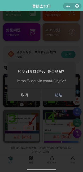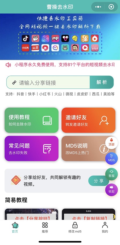 曹操去水印-免费一键去除各种视频水印,抖音、快手、微视、秒拍、陌陌、西瓜、哔哩、皮皮虾等等...轻松一键去水印。