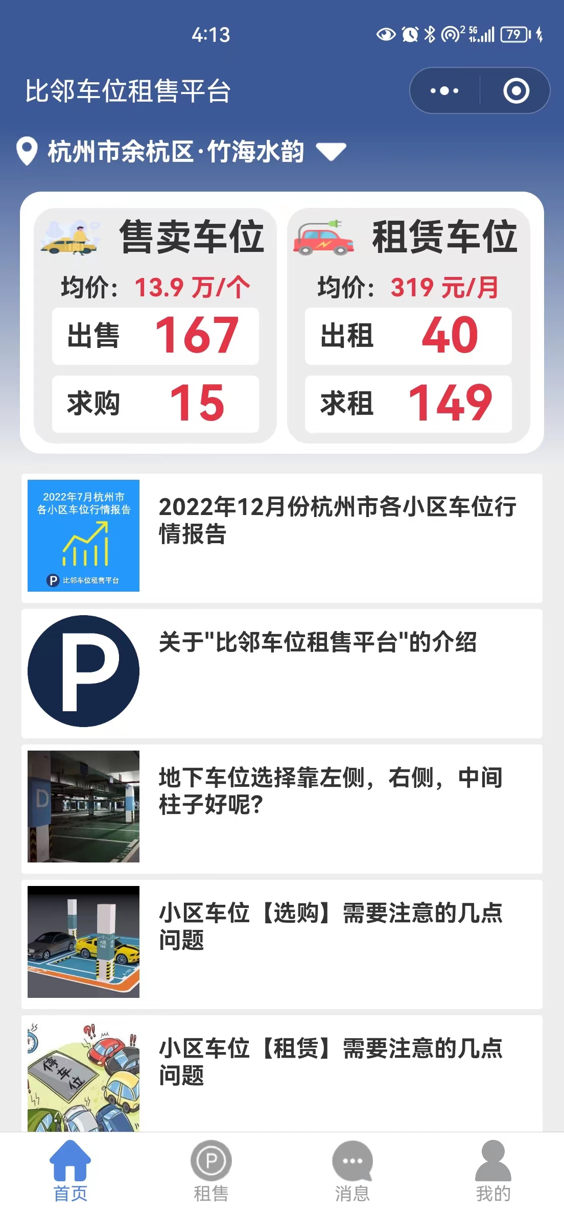“比邻车位租售平台”致力解决小区车位租售难题,免费为小区提供信息发布渠道,平台不收任何费用。所有信息由业主填写发布,客户与业主直接沟通,提高车位成交效率,省去中间费用。 基于微信生态圈进行推广,生成的海报分享至朋友圈;小程序链接分享至微信群;平台与小区公众平台进行绑定,可快速、精准将租售信息送至求租、求购方,促进车位成交。 能方便的与微信公众号实现集成,拓展小程序功能。