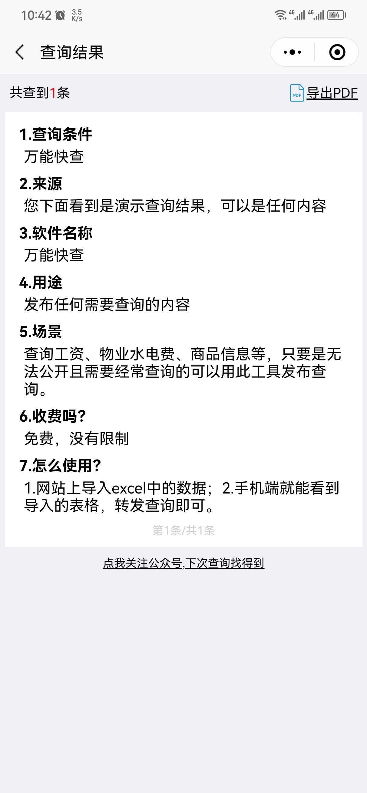 万能快查是构建手机端查询系统的便捷工具。我们经常需要给同事、同学、员工发送一些隐私信息,比如工资、考核结果、成绩单、缴费单、缴费明细、产品信息等等,如果一个个发,工作量很大,打成纸质的,无形增加了自己的工作量还容易泄密。万能快查就是专门为了解决这个问题而设计的微信小程序,只要您有excel文件,不到一分钟,把excel文件导入手机端,把程序转发给查询人,即可实现您自己的查询系统。